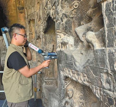 風(fēng)從河面吹來,悶熱的洞窟里有了絲絲涼意。古陽洞內(nèi),腳手架上,馬朝龍和同事正在進(jìn)行石窟測繪、病害監(jiān)測。