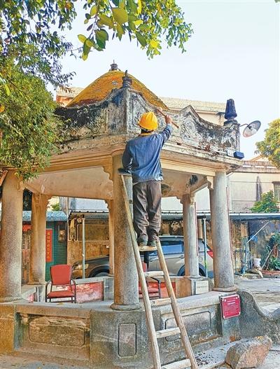 文物維修人員正在清理南朗街道濠涌村中山紀(jì)念亭的污垢。 江才松攝