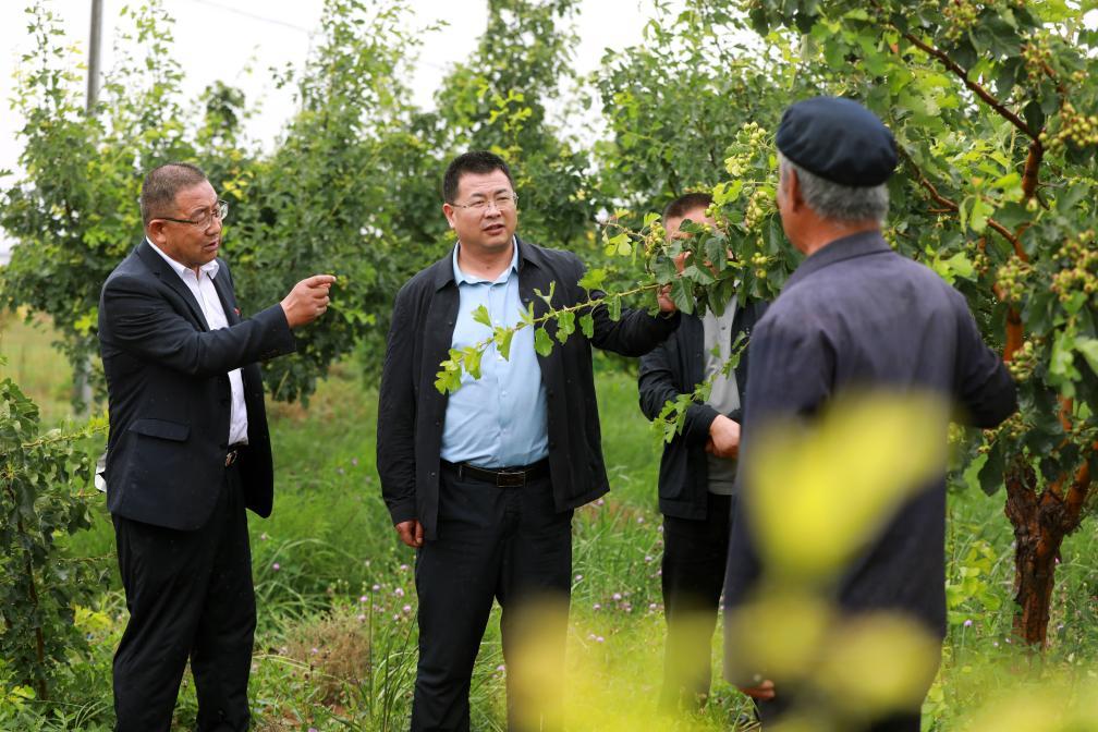 在富民新村的經(jīng)濟(jì)林栽植區(qū),古浪縣委組織部常務(wù)副部長俞永文(左二)與富民新村黨委書記兼村委會(huì)主任張延堂(左一)在和種植戶交流。新華社記者 郭剛 攝