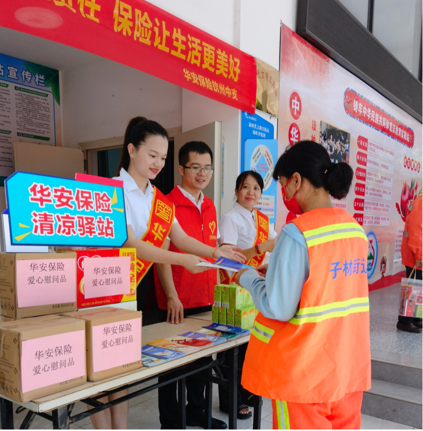 在廣西欽州白水塘社區(qū),華安保險(xiǎn)的工作人員在開展“清涼驛站”活動(dòng)慰問環(huán)衛(wèi)工人的同時(shí),也向往來群眾開展防范非法金融活動(dòng)宣傳;界首支公司在職場(chǎng)外設(shè)置了“清涼驛站”,連續(xù)多日為環(huán)衛(wèi)工人送上飲品、藥品和毛巾等防暑降溫物資;在湖北襄陽,工作人員前往襄州區(qū)西灣社區(qū)紅色驛站,把“清涼驛站”設(shè)在“紅色驛站”旁,一邊帶領(lǐng)員工開展紅色教育,一邊走進(jìn)社區(qū)開展保險(xiǎn)宣傳,將紅色文化與保險(xiǎn)互助理念相融合;在云南曲靖,華安保險(xiǎn)的員工參觀紅軍博物館重溫入黨誓詞,并在三百戶營村廣場(chǎng)組織員工和村民開展長征精神與保險(xiǎn)知識(shí)有獎(jiǎng)問答活動(dòng);在合肥蜀山區(qū)大溪地商業(yè)廣場(chǎng),華安保險(xiǎn)以“納涼+公益咨詢”的創(chuàng)新形式開展宣傳,為往來客戶送去納涼神器同時(shí),也把更多金融提醒向公眾進(jìn)行宣傳;7月7日下午,華安保險(xiǎn)湖南分公司在長沙東方悅鄰商業(yè)廣場(chǎng)設(shè)立宣傳展臺(tái),工作人員開展夏季用電安全知識(shí)有獎(jiǎng)測(cè)試,并向過往市民普及保險(xiǎn)知識(shí)、反欺詐技巧,同時(shí)為外賣和快遞小哥贈(zèng)送消暑飲用水。