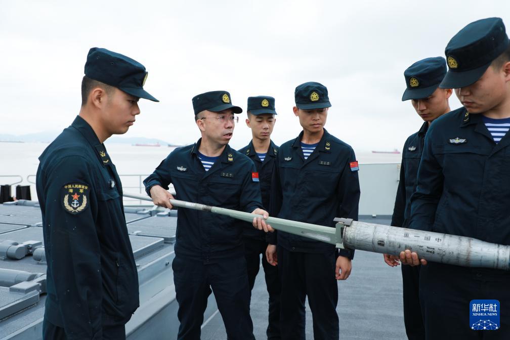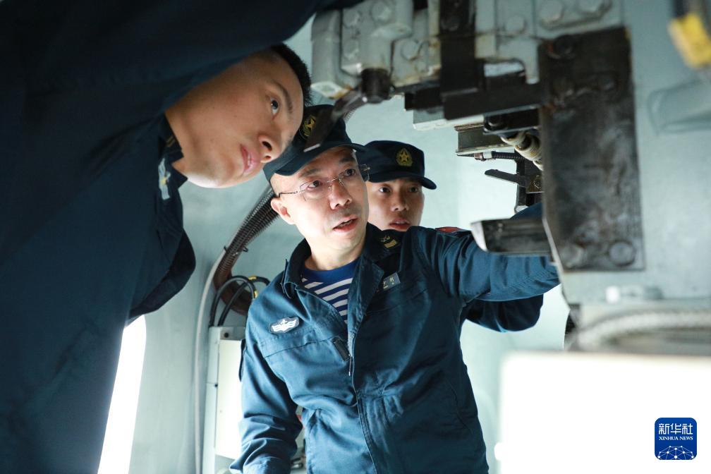 海軍資陽(yáng)艦主炮區(qū)隊(duì)長(zhǎng)馬少利(左二)向戰(zhàn)友演示專業(yè)工具使用方法(6月11日攝)。新華社記者 李秉宣 攝