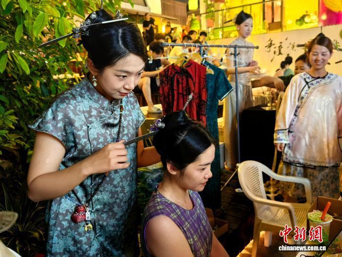 8月23日晚,福州煙臺山歷史風貌區(qū)的街巷熙熙攘攘,游客摩肩接踵。在鹽倉的三條簪非遺體驗現(xiàn)場,工作人員正在給一位女孩邊梳妝邊講解頭飾背后的文化寓意,不少路過的游客圍攏觀看,有的女孩也在一旁躍躍欲試。