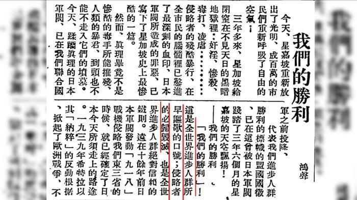 1945年9月9日出版的《星洲日報》與《總匯報》聯(lián)合版刊登《我們的勝利》的文章。圖片來源:新加坡國立大學官網