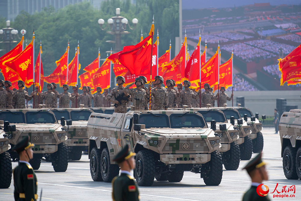 戰(zhàn)旗獵獵,鐵流滾滾。由80面抗戰(zhàn)英模部隊(duì)榮譽(yù)旗幟組成的戰(zhàn)旗方隊(duì)接受檢閱。