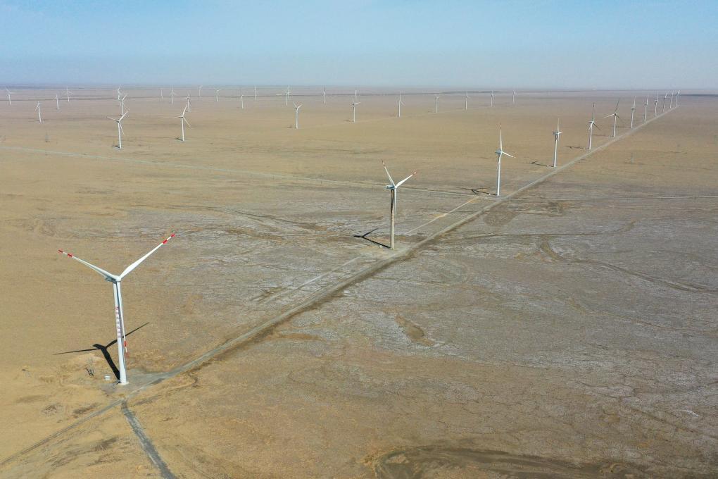 這是在新疆巴音郭楞蒙古自治州若羌縣拍攝的新天綠色能源股份有限公司新天若羌縣羅布莊10萬(wàn)千瓦風(fēng)電項(xiàng)目(6月27日攝,無(wú)人機(jī)照片)。新華社記者 丁磊 攝