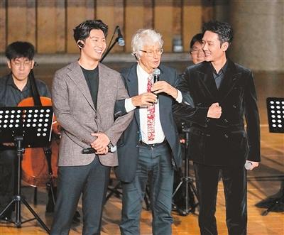 電影《狼圖騰》導(dǎo)演讓-雅克·阿諾(前排左二)與中國演員馮紹峰(前排右一)、竇驍在“光影百年·中法同行”電影音樂會(huì)上互動(dòng)。 新華社記者 謝晗攝