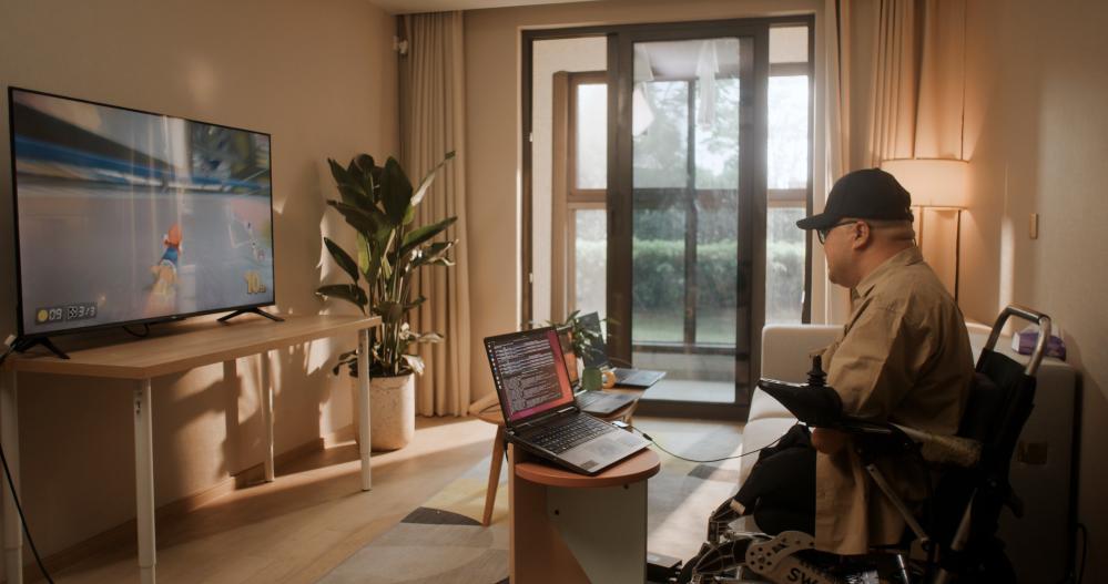 2025年4月30日,在位于上海的受試者住所,受試者通過腦機(jī)接口玩賽車游戲。新華社發(fā)(戴焱淼 攝)
