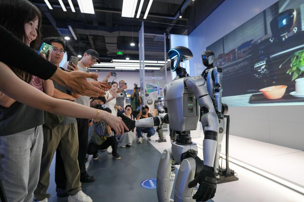 在位于北京經(jīng)開區(qū)的全球首個(gè)具身智能機(jī)器人4S店(ROBOT MALL)內(nèi),觀眾在與一款人形機(jī)器人握手(2025年8月6日攝)。新華社記者 鞠煥宗 攝