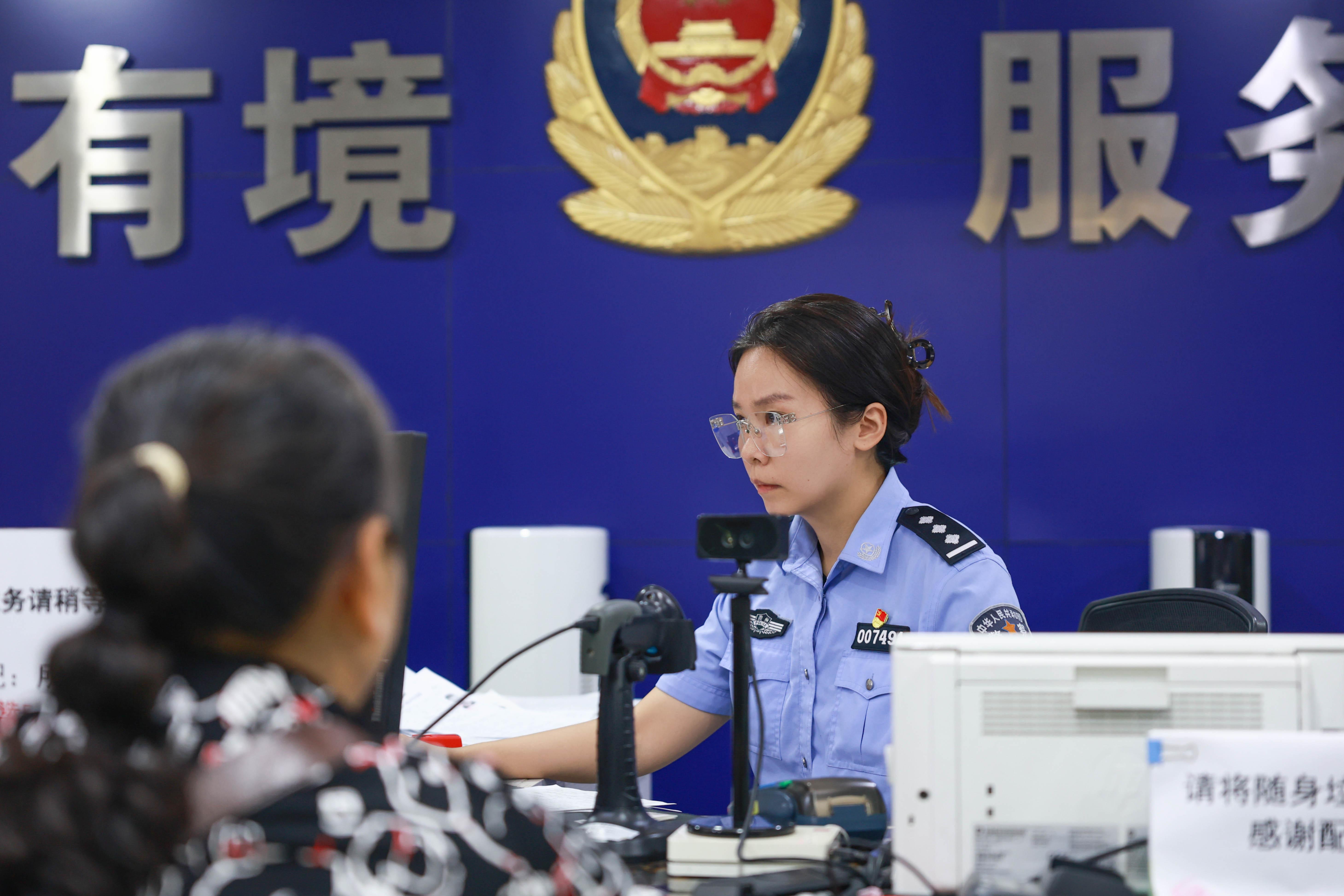 圖為出入境管理民警在為群眾辦理業(yè)務(wù)。