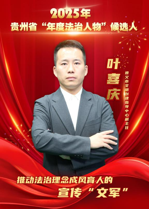 葉喜慶,現(xiàn)任貴州省遵義市文明創(chuàng)建指導(dǎo)中心副主任。2023年以來,他立足本職、守正創(chuàng)新,將法治理念、法治思維與法治方式融入精神文明建設(shè)各方面,以實際行動助推法治政府和文明遵義建設(shè)再上新臺階。