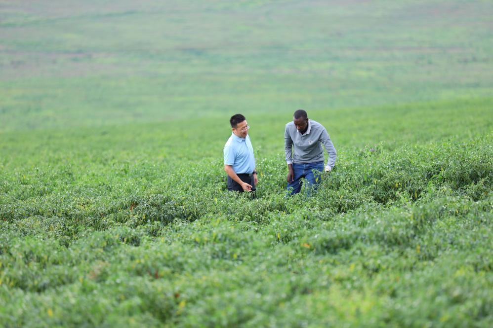 2025年5月22日,在盧旺達加紹拉農(nóng)場,湘農(nóng)國際非洲商務(wù)代表與當?shù)剞r(nóng)業(yè)技術(shù)員查看辣椒長勢。新華社記者吉莉攝