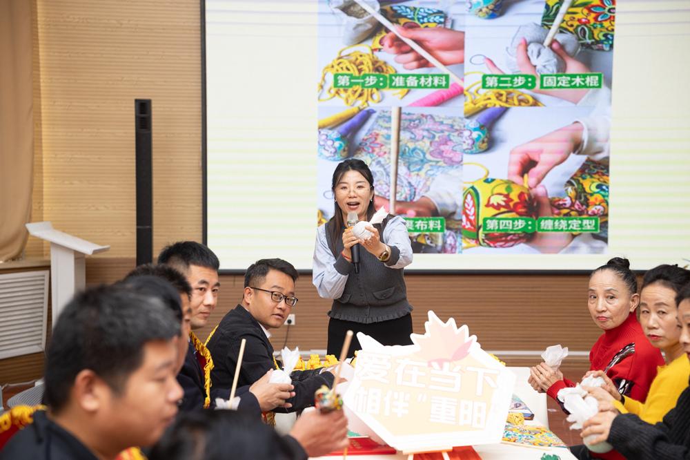 活動現(xiàn)場暖意融融,志愿者為到場長者佩戴寓意安康的茱萸香囊,一抹抹馨香中滿含誠摯祝福。傳統(tǒng)習(xí)俗體驗區(qū)里,區(qū)級“季評學(xué)雷鋒十佳事跡”代表和轄區(qū)居民一起分享孝親故事、體驗制作艾草養(yǎng)生錘、品嘗非遺面藝花饃,在互動交流中感受傳統(tǒng)文化的魅力。“我們的節(jié)日·重陽”主題文藝演出將活動氛圍推向高潮,靈動的表演、經(jīng)典的唱段、激昂的民樂輪番上演,贏得臺下陣陣掌聲。演出間隙穿插的重陽節(jié)傳統(tǒng)知識與移風(fēng)易俗主題互動問答,讓群眾在歡聲笑語中涵養(yǎng)文明新風(fēng)。