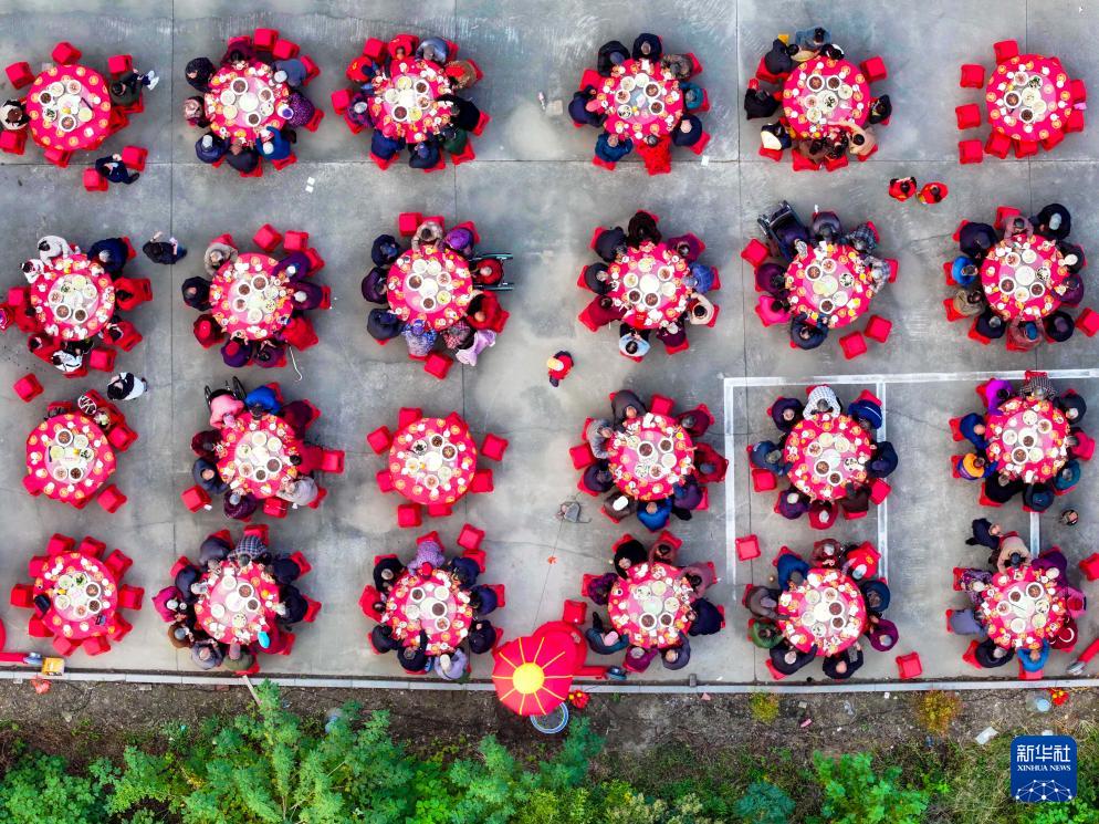 10月26日拍攝的江蘇省泰州市姜堰區(qū)白米鎮(zhèn)馬溝村第三屆重陽節(jié)“百壽宴”現(xiàn)場(chǎng)(無人機(jī)照片)。