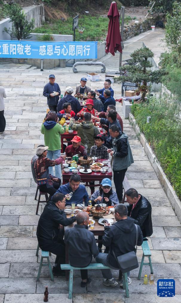 10月27日,愛心餐飲企業(yè)工作人員在官田村收購農(nóng)特產(chǎn)品后,舉辦“重陽宴”,邀請村里的老人們一起迎接重陽節(jié)。