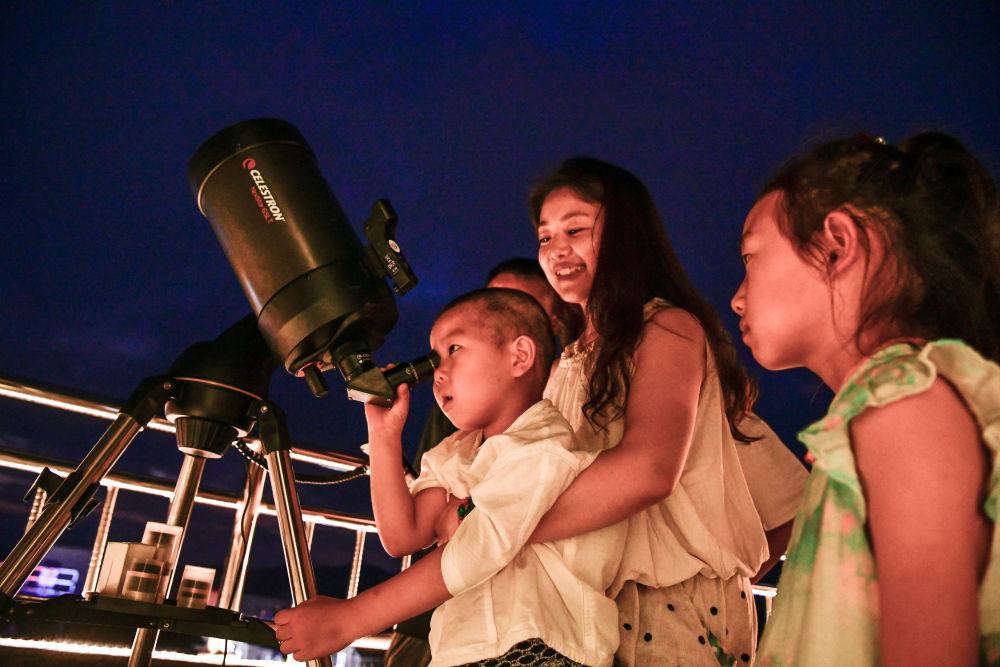 2025年7月9日,游客在貴州省平塘縣克度“天文小鎮(zhèn)”通過望遠鏡觀測星空。近年來,隨著旅游設(shè)施逐漸完善,距離“中國天眼”僅8公里的克度“天文小鎮(zhèn)”通過“科普+文旅”發(fā)展模式,帶動村民就業(yè)創(chuàng)業(yè)、增收致富。2025年1月至6月,“中國天眼”景區(qū)共接待游客約38萬人次,總收入2496萬余元。