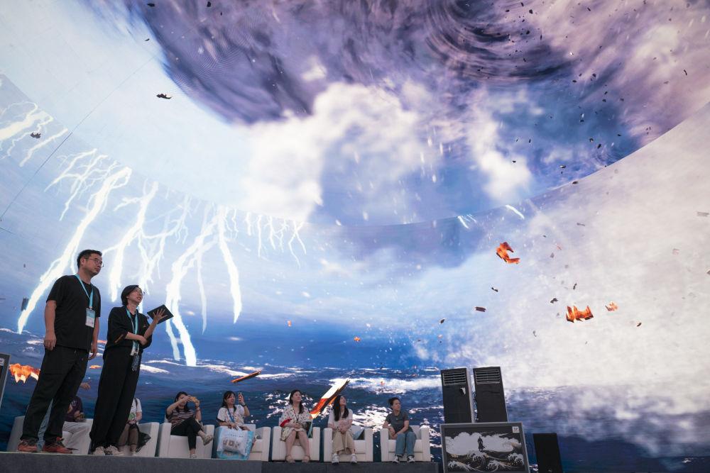 2024年7月22日,游客在“尋境敦煌——數(shù)字敦煌沉浸展”借助VR設(shè)備沉浸式游覽莫高窟第285窟虛擬場景?!皩ぞ扯鼗汀獢?shù)字敦煌沉浸展”綜合運用VR虛擬現(xiàn)實、三維建模、游戲引擎的物理渲染和全局動態(tài)光照等新技術(shù),高精度立體還原了莫高窟第285窟。游客戴上VR眼鏡,不僅可以零距離觀賞壁畫、360度自由探索洞窟細節(jié),還能“飛升”到窟頂,身臨其境參與壁畫故事情節(jié),沉浸式感受敦煌文化的魅力。