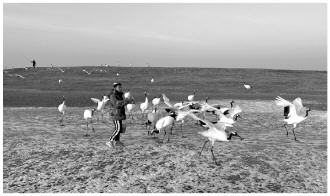 12月初的黑龍江扎龍國家級(jí)自然保護(hù)區(qū),地面上覆蓋著積雪,成片蘆葦在風(fēng)中搖曳。伴隨著訓(xùn)飛員的旗幟與口令,成群的丹頂鶴從山坡上迎風(fēng)飛起,在空中飛舞盤旋后,優(yōu)雅地落到黃色蘆葦?shù)厣稀?/p>