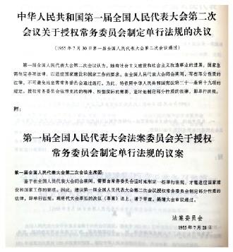 1955年7月30日,根據(jù)法案委員會的建議,一屆全國人大二次會議作出決定:“隨著社會主義建設和社會主義改造事業(yè)的進展,國家急需制定各項法律,以適應國家建設和國家工作的要求。在全國人民代表大會閉會期間,有些部分性質(zhì)的法律,不可避免地急需常務委員會通過施行。為此,特依照中華人民共和國憲法第三十一條第十九項的規(guī)定,授權(quán)常務委員會依照憲法的精神、根據(jù)實際的需要,適時地制定部分性質(zhì)的法律,即單行法規(guī)?!痹摏Q定改變了全國人大是行使國家立法權(quán)唯一機關(guān)的規(guī)定,是對1954年憲法的重要補充和發(fā)展。