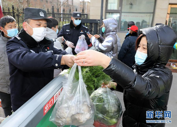 1月10日,在石家莊市橋西區(qū)東風北路社區(qū),民警在協(xié)助蔬菜配送員為居民配送蔬菜?!?/span>
