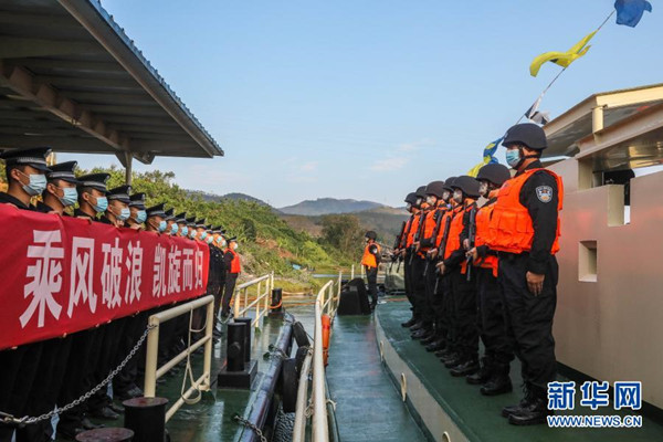 2月23日,參巡隊員在執(zhí)法艇上列隊站坡與岸上歡送的民警告別?! ⌒氯A社發(fā)(趙越 攝)