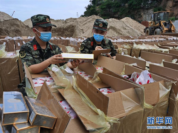 海警執(zhí)法員點(diǎn)驗(yàn)涉案走私香煙(6月1日攝)。 新華社發(fā)