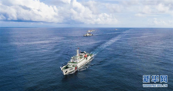 海警艦艇編隊(duì)在轄區(qū)海域巡邏(7月7日攝,無人機(jī)照片)。 新華社發(fā)
