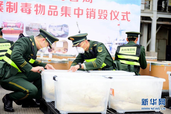 海警執(zhí)法員點(diǎn)驗(yàn)涉案制毒物品(2月25日攝)。 新華社發(fā)