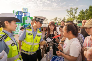 近日,陜西省西安市公安局交警支隊新城大隊聯(lián)合西安市商務(wù)局開展“生命無價 酒后禁駕”交通安全主題宣傳。圖為民警通過演示酒精檢測儀宣傳交通安全知識。