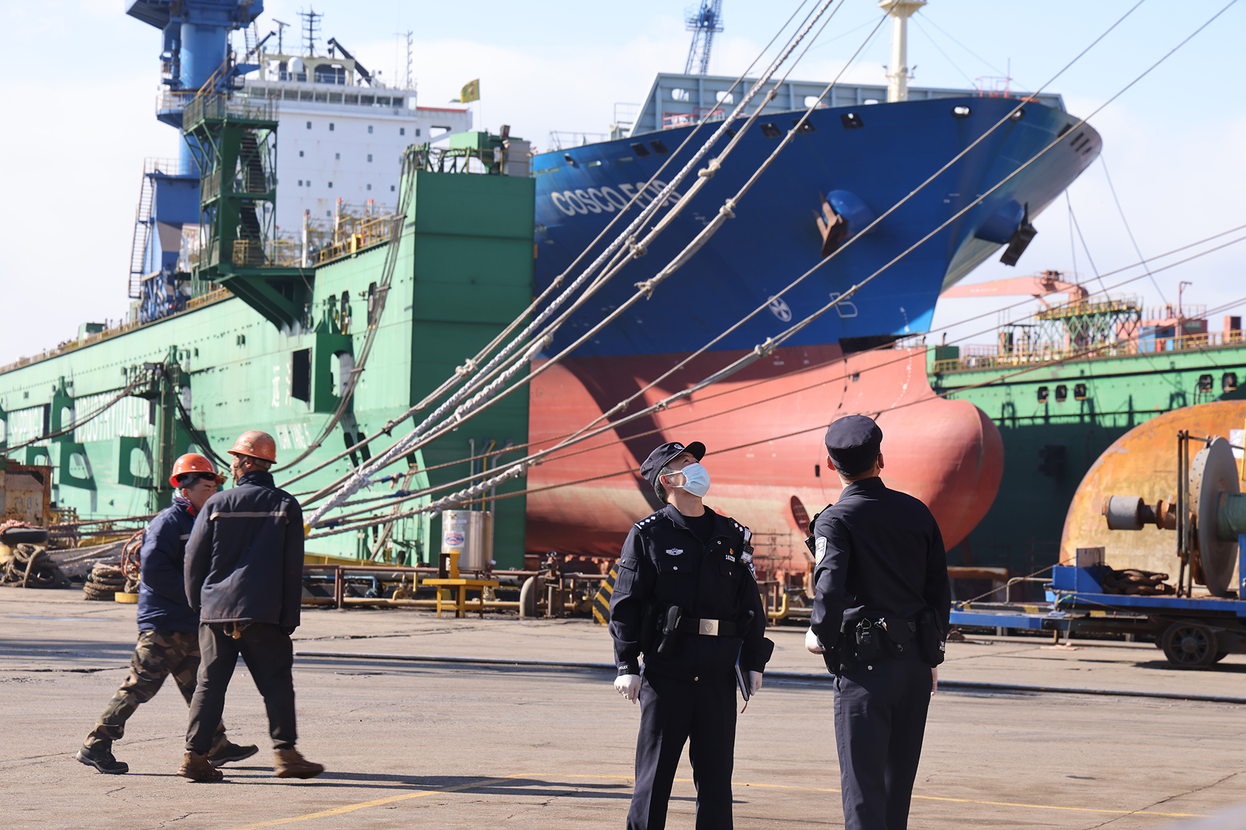 近日,遼寧大連出入境邊防檢查站出臺服務(wù)海港口岸高質(zhì)量發(fā)展十一項措施提升通關(guān)便利化水平,內(nèi)容包括創(chuàng)新實(shí)現(xiàn)邊檢通關(guān)進(jìn)度“一鍵直推”、開通“邊檢即時通”平臺、保障特定類型船舶“特辦快辦”等。圖為11月14日,民警走訪造船企業(yè)。