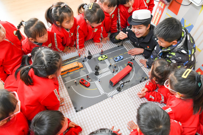 近日,安徽省含山縣公安局交管大隊(duì)組織民警走進(jìn)幼兒園開(kāi)展以“小手拉大手 安全文明出行”為主題的交通安全宣傳活動(dòng),增強(qiáng)幼兒道路交通安全意識(shí)。圖為民警通過(guò)模擬道具與孩子們互動(dòng)交流。
