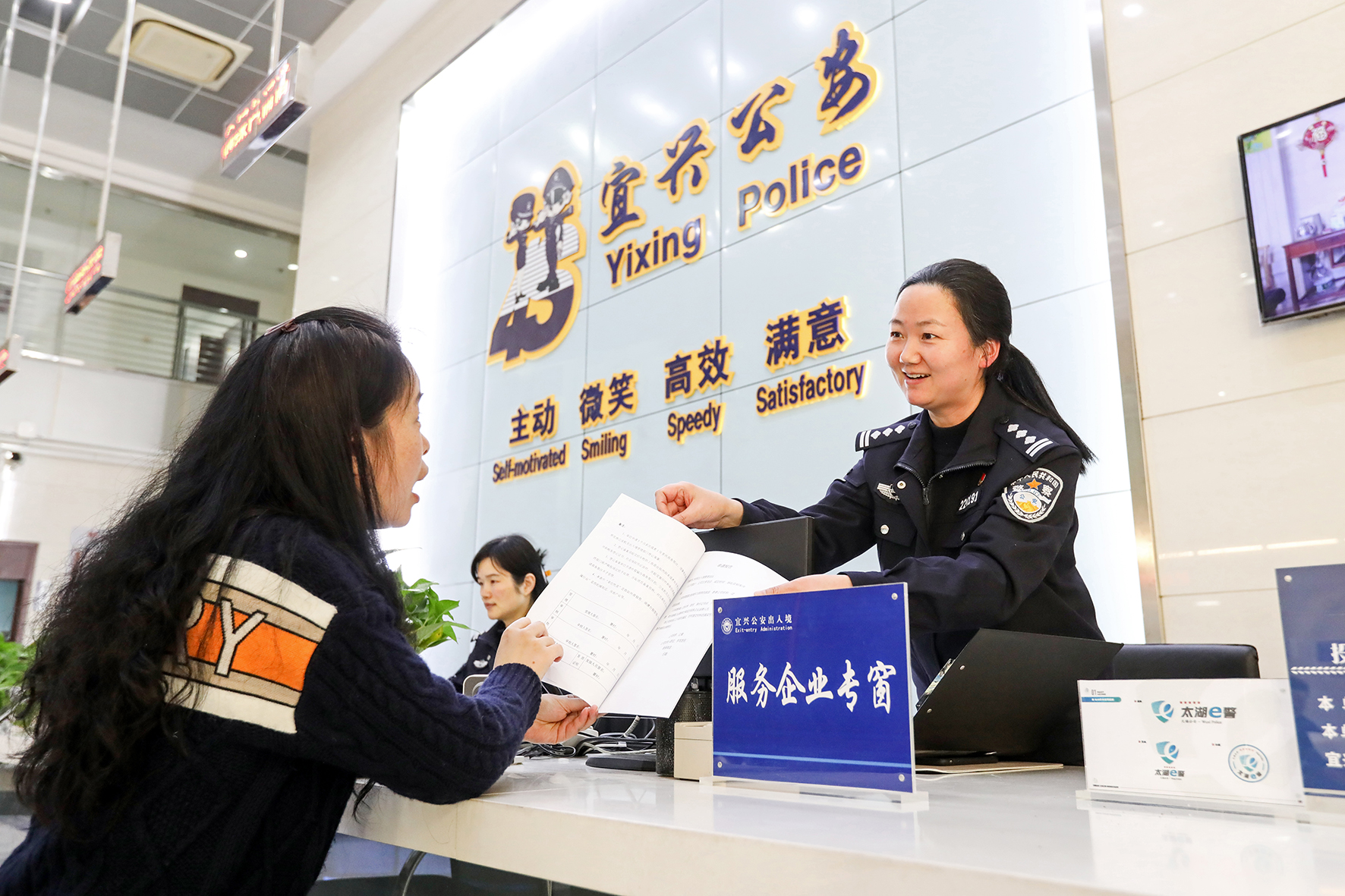 1月15日,江蘇省宜興市公安局出入境管理大隊(duì)民警向企業(yè)人員介紹商務(wù)簽注辦理流程。