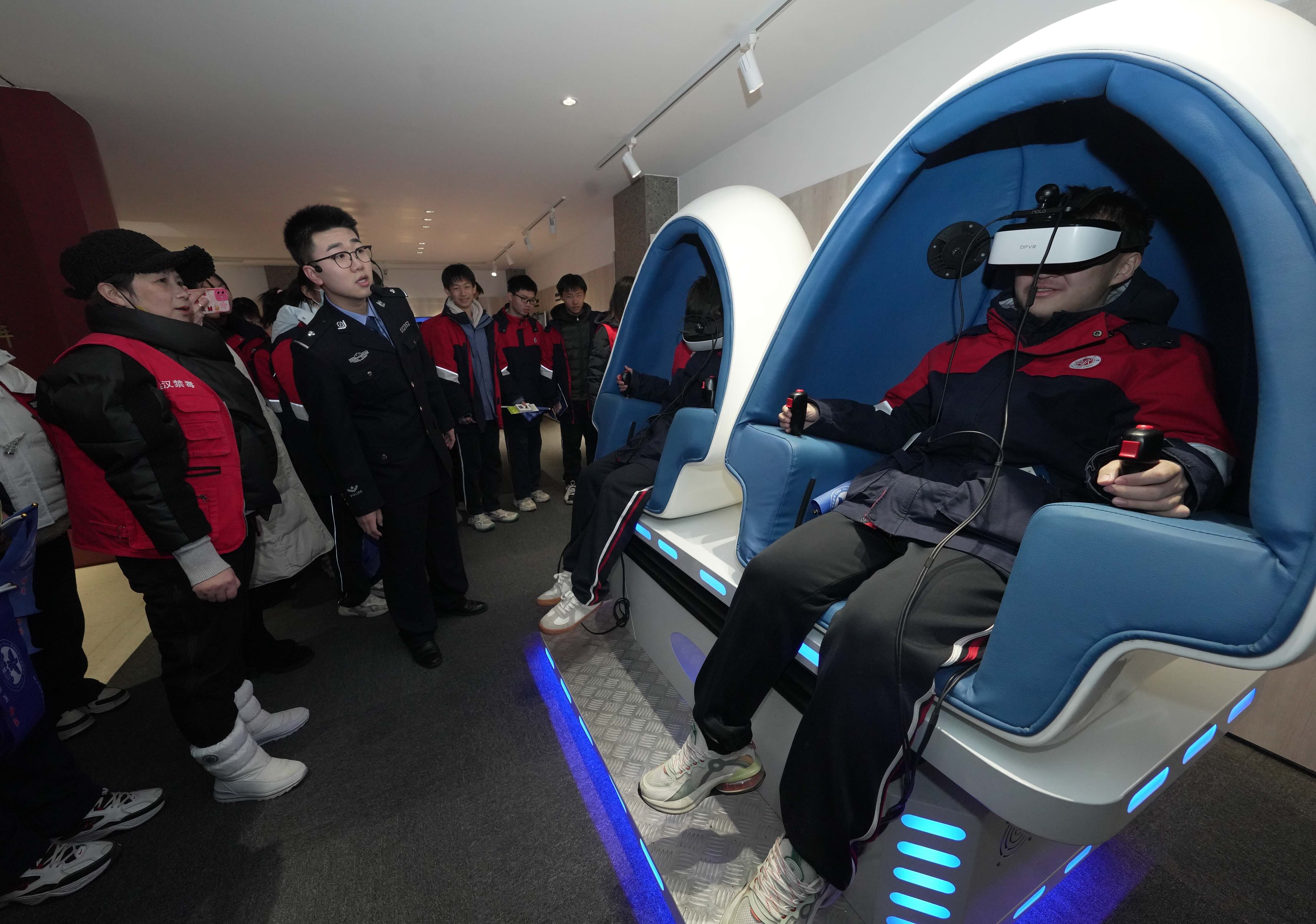 2月26日,湖北武漢3136所中小學(xué)、幼兒園正式開學(xué),武漢警方按照“一校一方案、一專班、一領(lǐng)導(dǎo)”要求,全面筑牢校園安全屏障。圖為武昌區(qū)公安分局民警走進(jìn)武漢中學(xué)開展“開學(xué)第一課”宣講活動(dòng),學(xué)生們借助VR設(shè)備學(xué)習(xí)禁毒、反詐等法律知識(shí)。