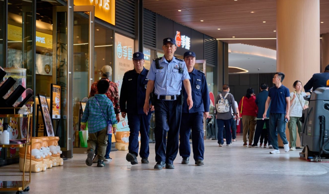 “五一”假期期間,北京市昌平區(qū)超極合生匯日均客流近15萬人,成為昌平警方開展安保工作的重點點位之一。昌平公安分局最大化前置警力,組織屬地派出所與內(nèi)保、治安、交警、特警、消防、群防群治力量聯(lián)勤協(xié)作,確保治安和交通秩序平穩(wěn)。圖為民警在超極合生匯周邊開展巡邏。