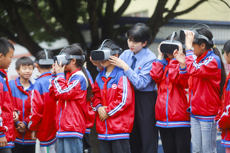 6月17日,貴州省黔西市人民檢察院組織檢察官走進(jìn)轄區(qū)雨朵鎮(zhèn)扯泥小學(xué),開展禁毒主題宣傳活動(dòng),通過(guò)展示毒品模型、發(fā)放宣傳頁(yè)、VR眼鏡認(rèn)識(shí)毒品危害等,向?qū)W生講解新型毒品種類、特征和危害,提高學(xué)生識(shí)毒、拒毒、防毒意識(shí)。圖為檢察官指導(dǎo)小學(xué)生利用VR眼鏡認(rèn)識(shí)毒品的危害。