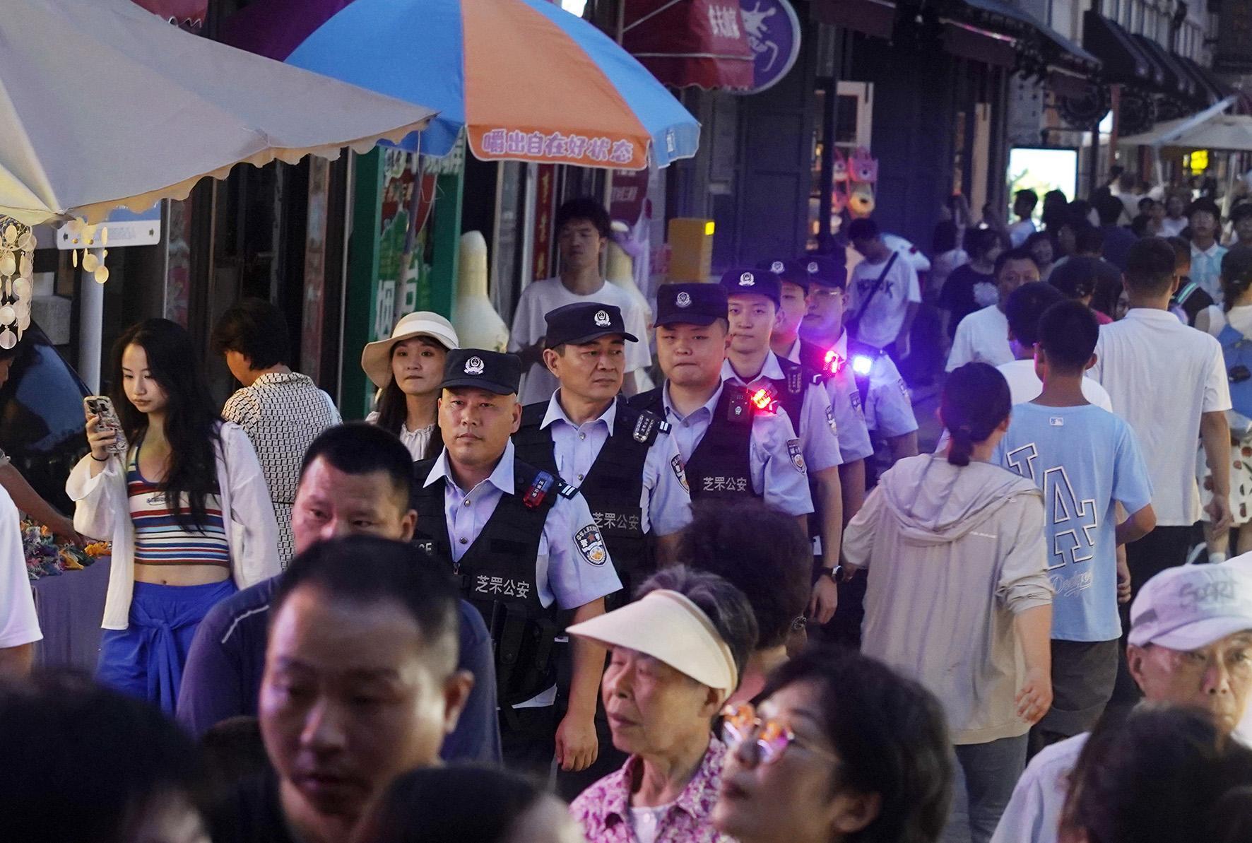 近日,山東省煙臺(tái)市公安局開展夏夜治安巡查宣防第二次集中統(tǒng)一行動(dòng),組織警力加大對景區(qū)、車站等人員密集區(qū)域的檢查和巡防力度,全力營造安全穩(wěn)定的社會(huì)治安環(huán)境。圖為煙臺(tái)市公安局芝罘分局民警在朝陽街景區(qū)巡邏。