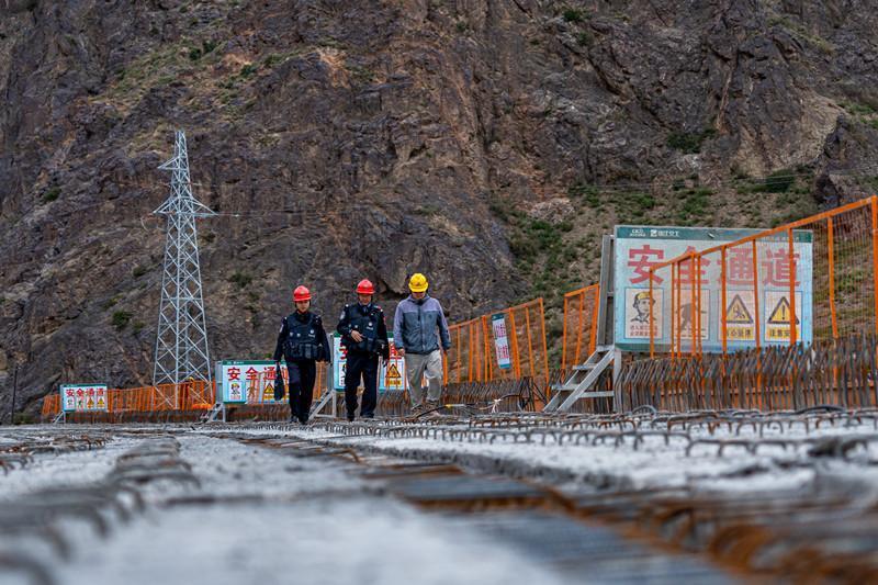 近日,新疆出入境邊防檢查總站克州邊境管理支隊托云邊境派出所民警走進(jìn)轄區(qū)一在建道路施工項目工地開展安全生產(chǎn)檢查,宣講法律知識,做好安全提醒,保障工程早日竣工。圖為民警在施工現(xiàn)場排查風(fēng)險隱患。