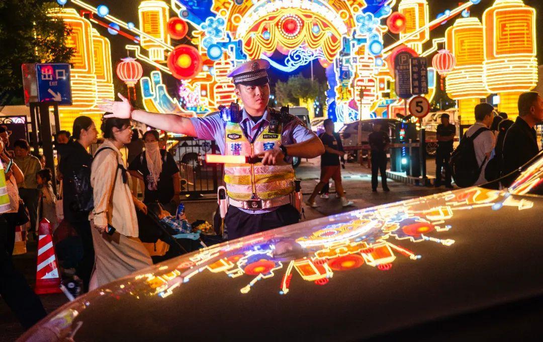 “京彩燈會(huì)”近日在北京園博園正式啟幕,約4萬名游客暢游燈海。針對(duì)人流量大等情況,北京豐臺(tái)警方在燈會(huì)9個(gè)區(qū)域按不同等級(jí)梯次投入安保警力,全力為燈會(huì)保駕護(hù)航。圖為交警在燈會(huì)周邊疏導(dǎo)交通。