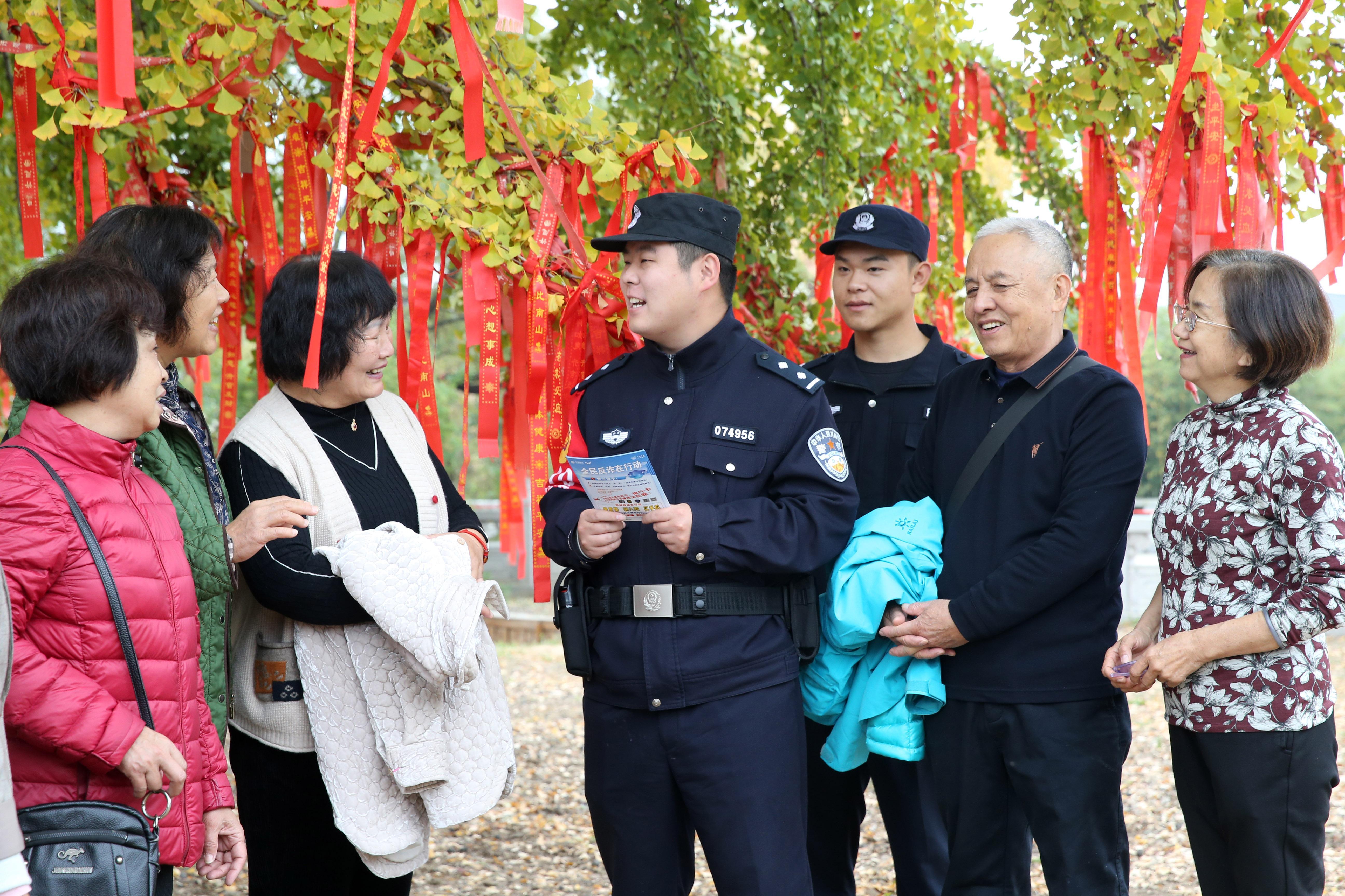 近日,山東省臨沂市郯城縣新村銀杏開發(fā)區(qū)內(nèi)的三千年古銀杏樹進(jìn)入最佳觀賞期,吸引眾多游客前來(lái)打卡。郯城縣公安局新村派出所民警來(lái)到景區(qū)開展反詐宣傳活動(dòng),提高游客的防詐意識(shí)。圖為十一月十日,民警向游客普及反詐知識(shí)。