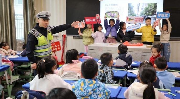11月20日,江西省九江市公安局交管支隊(duì)第一大隊(duì)組織民警到轄區(qū)東鳳小學(xué)開展交通安全宣傳活動(dòng)。圖為民警給學(xué)生們上交通安全課。