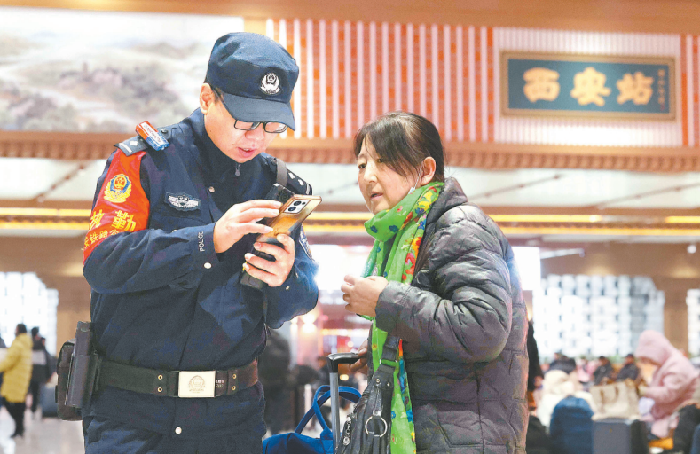 1月1日,西安鐵路公安局西安公安處民警堅守崗位,護航旅客平安出行。圖為民警在西安火車站候車室?guī)椭每徒鉀Q問題。