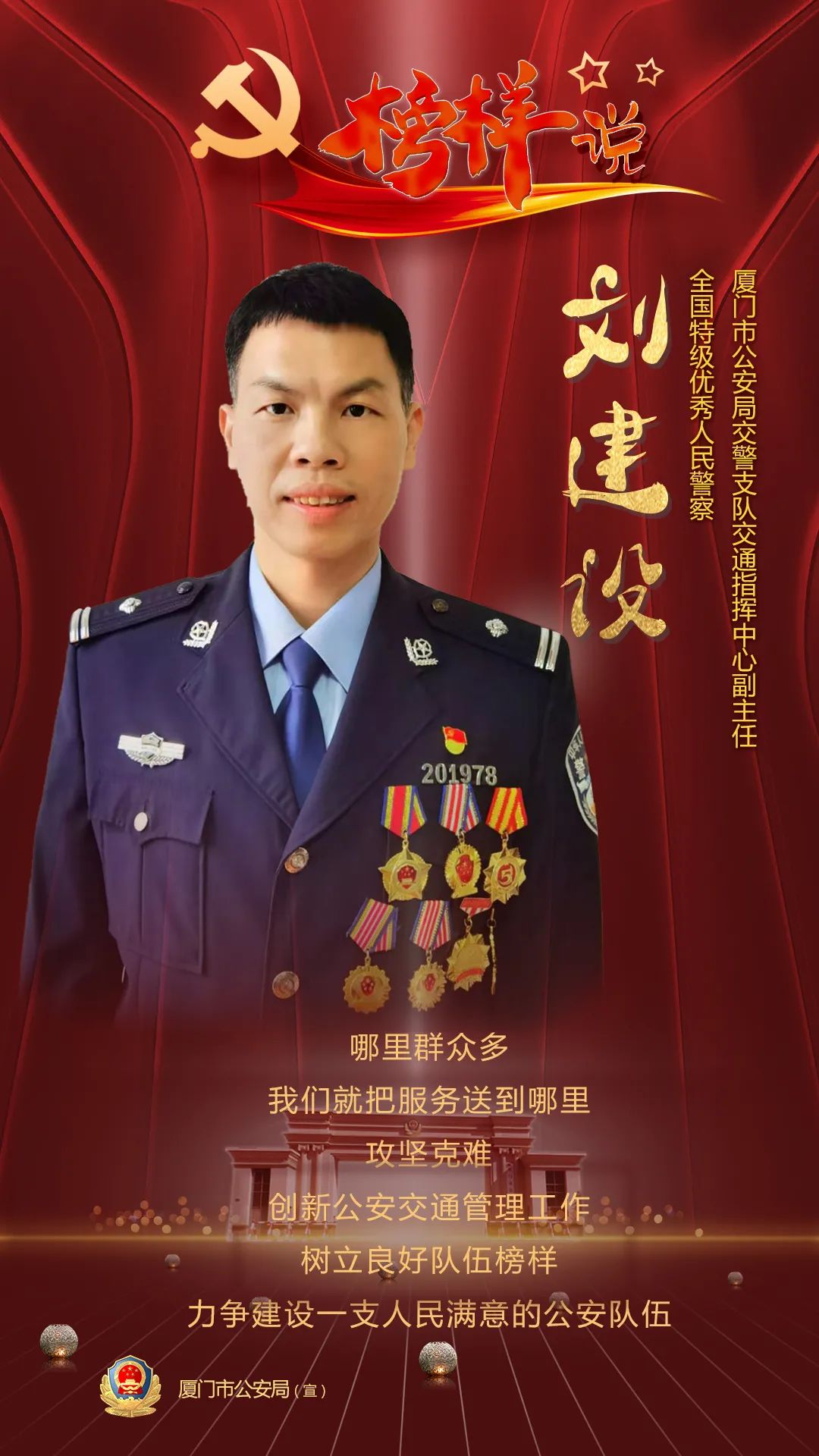 劉建設(shè) 40歲,漢族,中共黨員,廈門大學(xué)計(jì)算機(jī)系畢業(yè),碩士研究生學(xué)位,2003年12月入警,現(xiàn)任廈門市公安局交警支隊(duì)交通科研設(shè)施大隊(duì)教導(dǎo)員。先后榮獲“全國(guó)特級(jí)優(yōu)秀人民警察”“公安部基層技術(shù)革新二等獎(jiǎng)”“中國(guó)好交警”“福建省五一勞動(dòng)獎(jiǎng)?wù)隆薄案=ㄊ∠冗M(jìn)工作者”廈門市“我最喜愛的十佳民警”等多項(xiàng)榮譽(yù)和獎(jiǎng)項(xiàng),榮立個(gè)人二等功1次、個(gè)人三等功2次。
