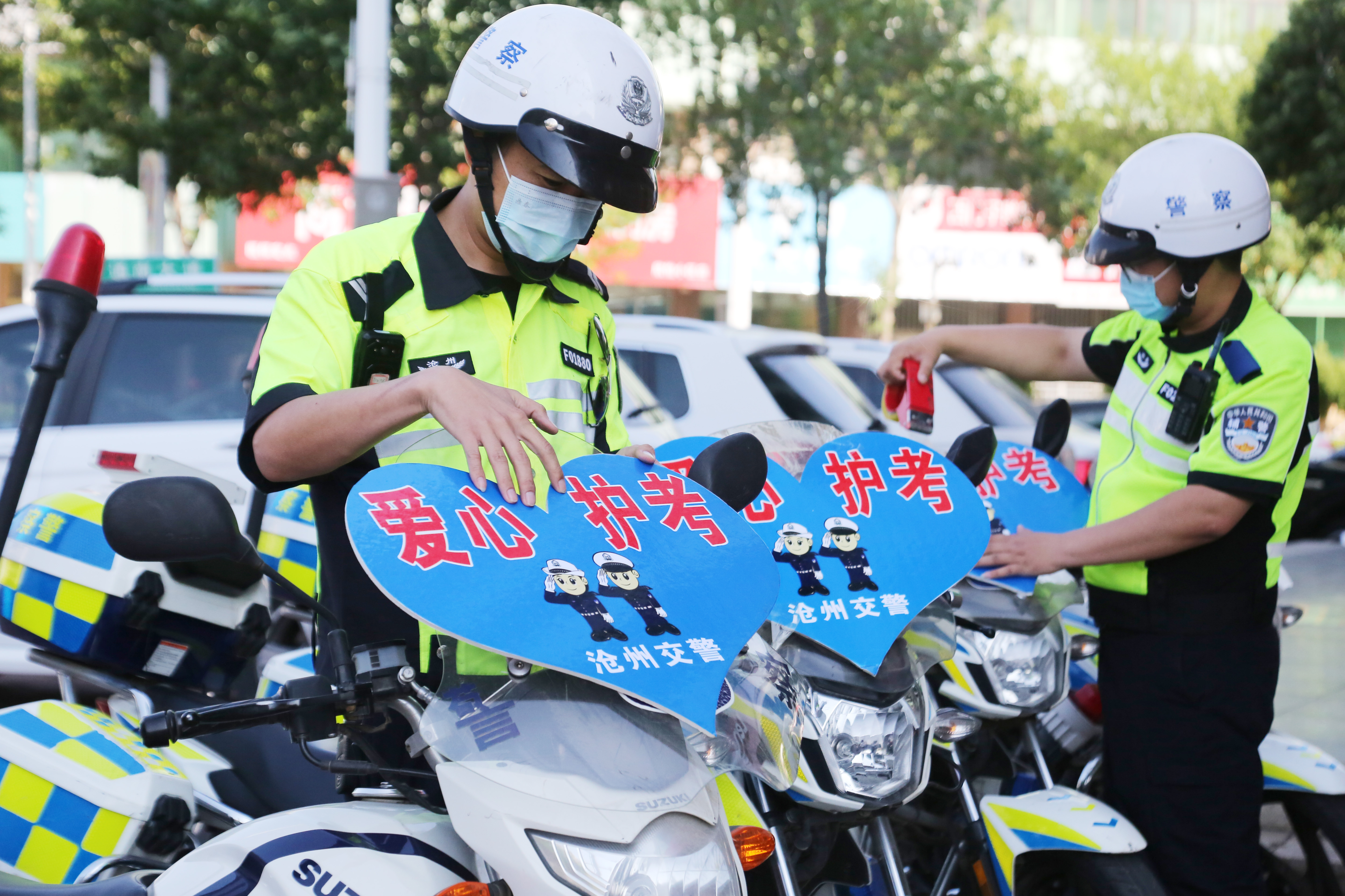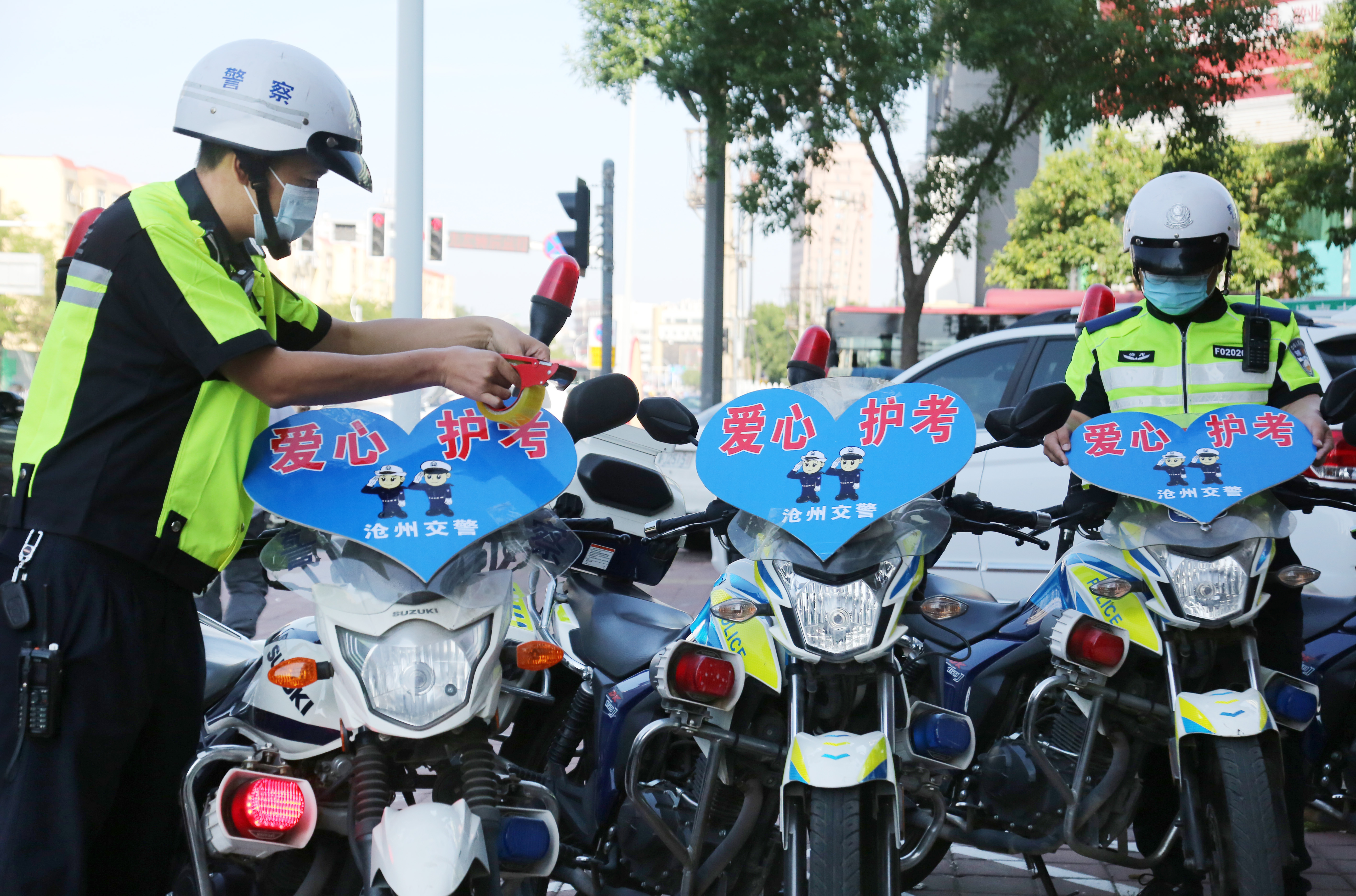 高考在即,河北省滄州市交警提前部署高考護(hù)考管控措施,參加維護(hù)高考交通秩序和護(hù)送考生車輛的執(zhí)勤交警提前進(jìn)入高考狀態(tài),以良好的精神狀態(tài)為高考學(xué)子和接送考生的車輛“護(hù)航”。圖為滄州市公安交警支隊二大隊鐵騎交警提前行動,細(xì)心檢查摩托車機(jī)械運行狀況、粘貼“愛心護(hù)考”標(biāo)識牌,“備戰(zhàn)”高考。
