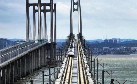 圖為8月31日,福廈高鐵運(yùn)行試驗(yàn)列車駛過(guò)福廈高鐵泉州灣跨海大橋。胡鵬/攝