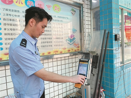 民警展示“碼上回家·預約小精靈”小程序,用二維碼掃一掃智能機器即可向家長發(fā)送離校信息。