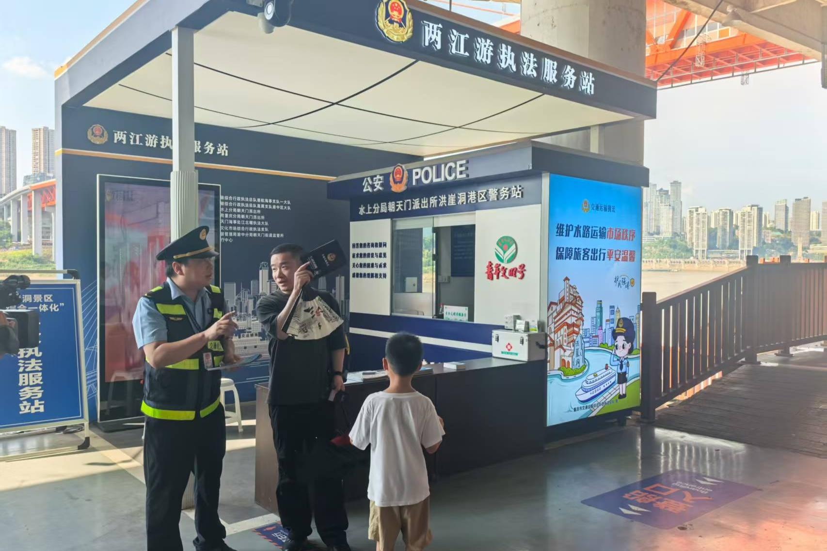 針對(duì)兩江游游客易迷路問題,執(zhí)法總隊(duì)設(shè)立服務(wù)站,提供道路指引、乘船咨詢等服務(wù),配備急救用品、飲用水、藥品等免費(fèi)物資。據(jù)介紹,今年暑運(yùn)兩江游日均客流超1.1萬人,服務(wù)站日均服務(wù)超300人次。