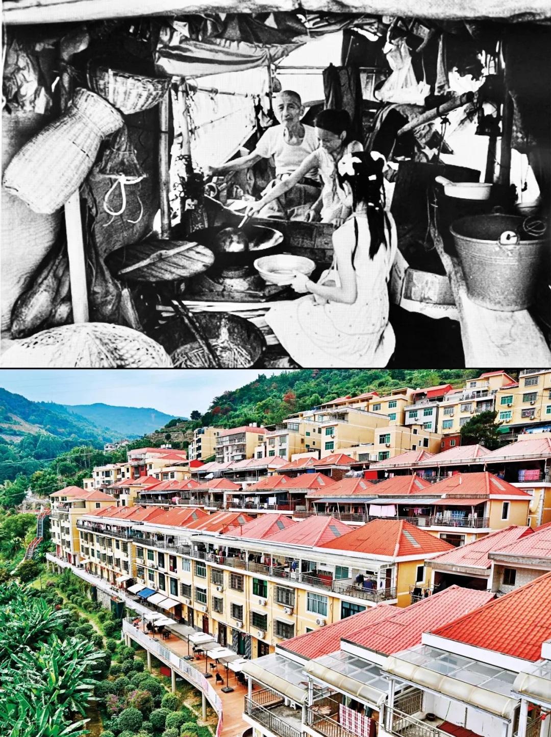 在福建省寧德市福安市下岐村,歷史上,村民祖祖輩輩以在淺海灘涂“討小?!睘樯?,一條小木船就是幾代人的家,生活條件異常艱苦,被稱為“連家船民”。20世紀90年代,福建“造福工程”啟動,下岐村采取“分期分批,全面搬遷”的辦法,將2000多名漁民安置上岸。如今的下岐村,成排的小洋樓矗立,漁民廣場、白馬公園等休閑設施一應俱全,呈現(xiàn)出一幅百姓安居樂業(yè)的現(xiàn)代鄉(xiāng)村圖景。圖為拼版照片:上圖為20世紀80年代福建寧德地區(qū)的連家船民生活場景(資料照片);下圖為2023年11月15日拍攝的下岐村(新華社記者 姜克紅/攝)。 新華社發(fā)