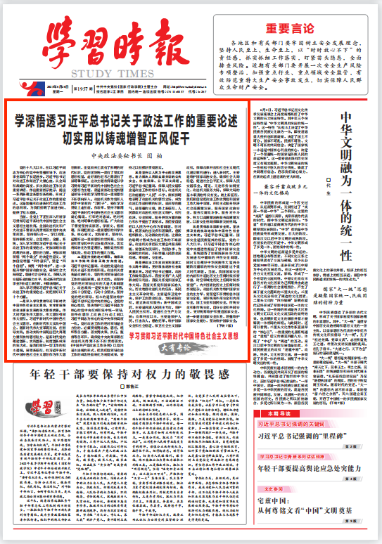 當(dāng)前,全黨上下正在深入開展學(xué)習(xí)貫徹習(xí)近平新時(shí)代中國特色社會主義思想主題教育。全國政法機(jī)關(guān)和廣大政法干警要認(rèn)真貫徹落實(shí)黨中央決策部署,堅(jiān)持知行合一、學(xué)以致用,堅(jiān)持聯(lián)系實(shí)際、立足崗位,全面、系統(tǒng)、深入學(xué)習(xí)貫徹習(xí)近平總書記關(guān)于政法工作的重要論述,更加深刻體悟真理的味道、思想的力量,更加深刻領(lǐng)悟“兩個確立”的決定性意義,更加自覺增強(qiáng)“四個意識”、堅(jiān)定“四個自信”、做到“兩個維護(hù)”,進(jìn)一步提升維護(hù)國家政治安全、確保社會大局穩(wěn)定、促進(jìn)社會公平正義、保障人民安居樂業(yè)的能力水平,推動新時(shí)代政法事業(yè)不斷邁上新臺階、開辟新境界。