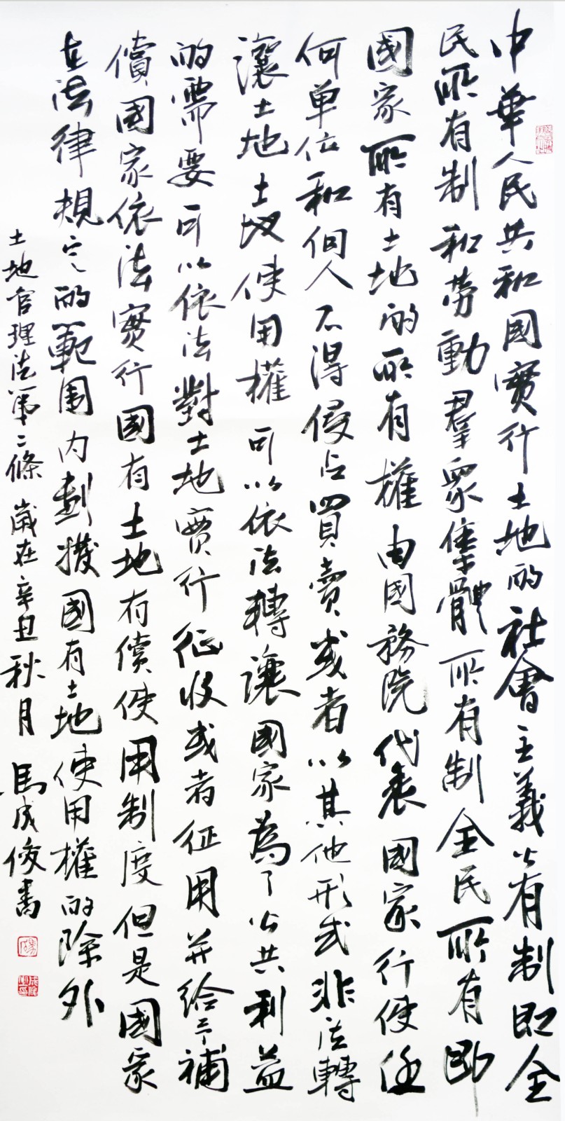 繼1600余位書法家參與書寫《中華人民共和國民法典》全部1260條法條之后,法治日報社聯(lián)合自然資源部法規(guī)司、自然資源部書畫研究會和北京昌平書法家協(xié)會,將筆端對準土地管理“一法一條例”,即《中華人民共和國土地管理法》和《中華人民共和國土地管理法實施條例》。