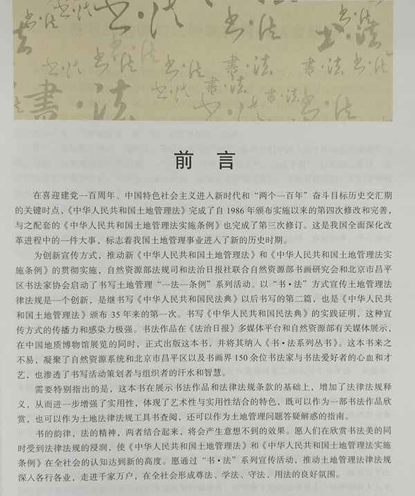 書以馭字,法以興邦;書法一體,墨法同彰。本書既可以作為一部書法作品欣賞,也可以作為土地法律法規(guī)工具書查閱,還可以作為土地管理問題答疑解惑的指南。希望這套叢書可以讓讀者在欣賞書法美的同時受到法律法規(guī)的浸潤,推動土地管理法律法規(guī)深入各行各業(yè)、走進千家萬戶,在全社會形成尊法、學(xué)法、守法、用法的良好氛圍。