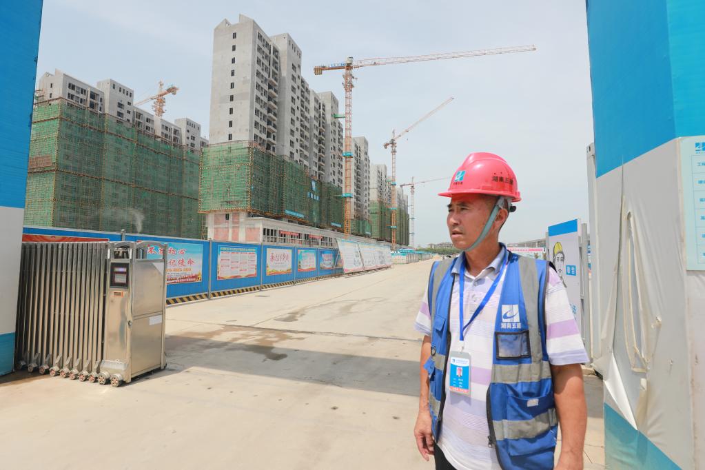 湖南省沅江市的漁民新村,10棟17層電梯房已經封頂,正在建設的6棟大樓周邊,塔吊林立,工程車輛往返,工人們正熱火朝天地干著活兒。